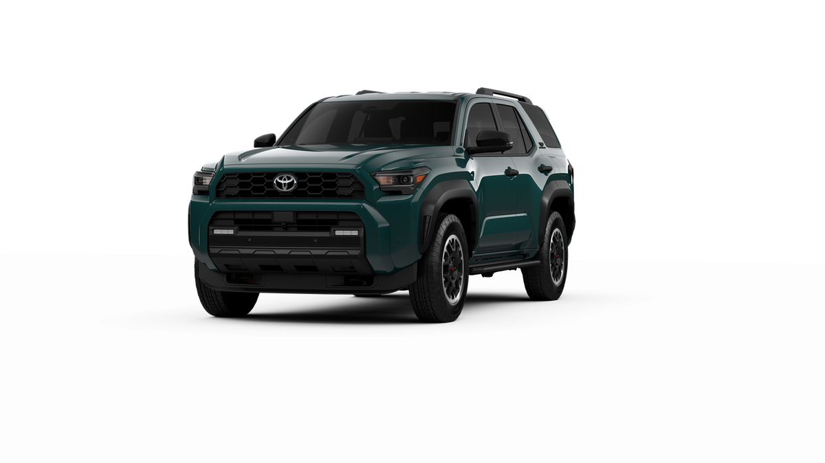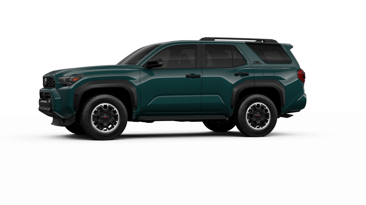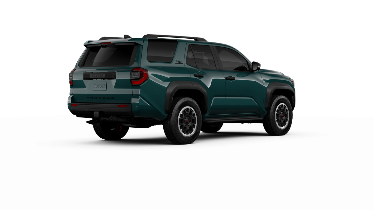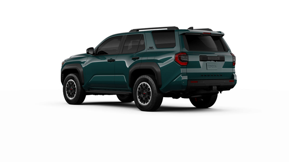 - Black honeycomb-style grille, mirror caps, door handles, and overfenders; color-keyed rear spoiler; black "TRD OFF ROAD" and "4RUNNER" badges